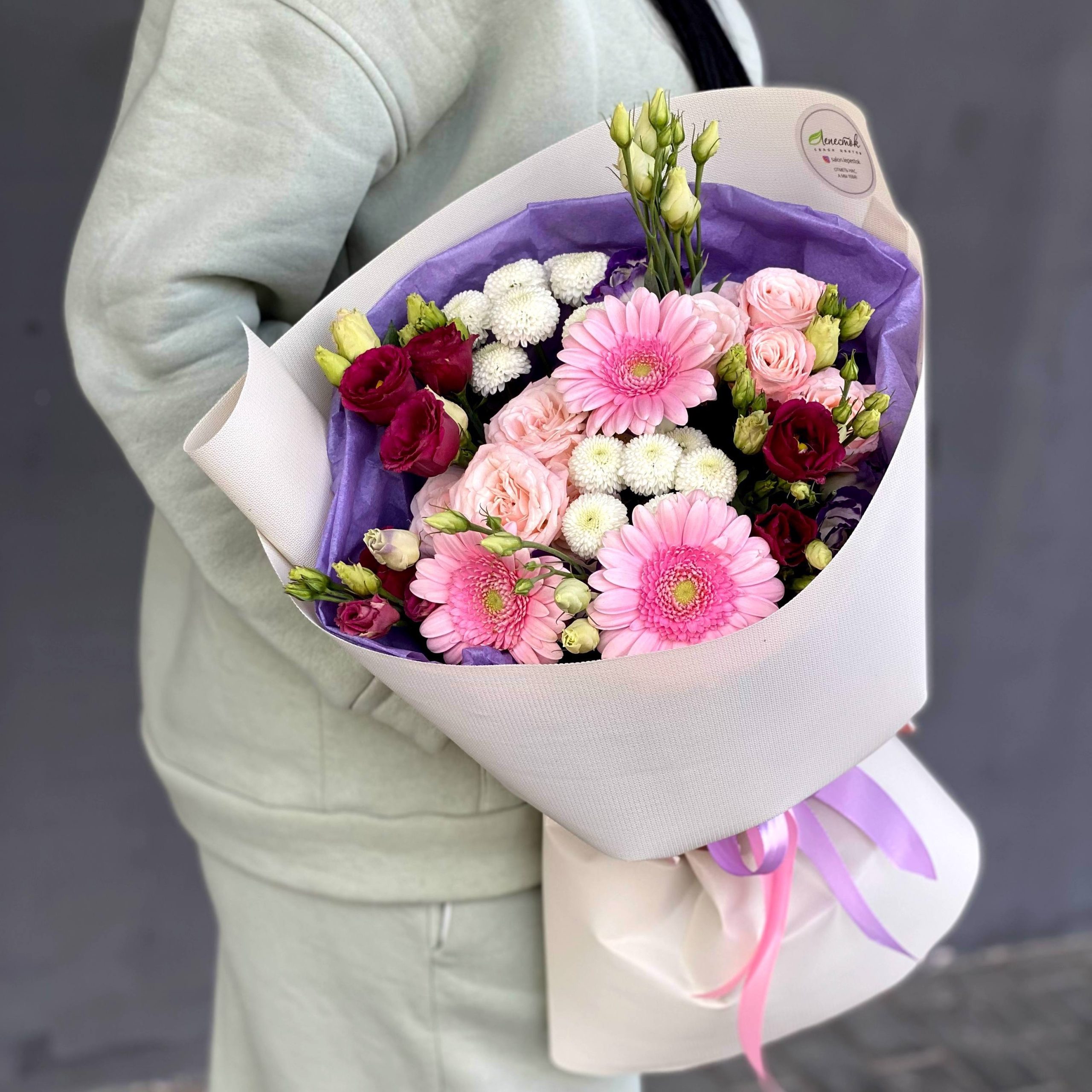 Букет из гербер, бордовой эустомы и хризантемы Ньютон в Лузе