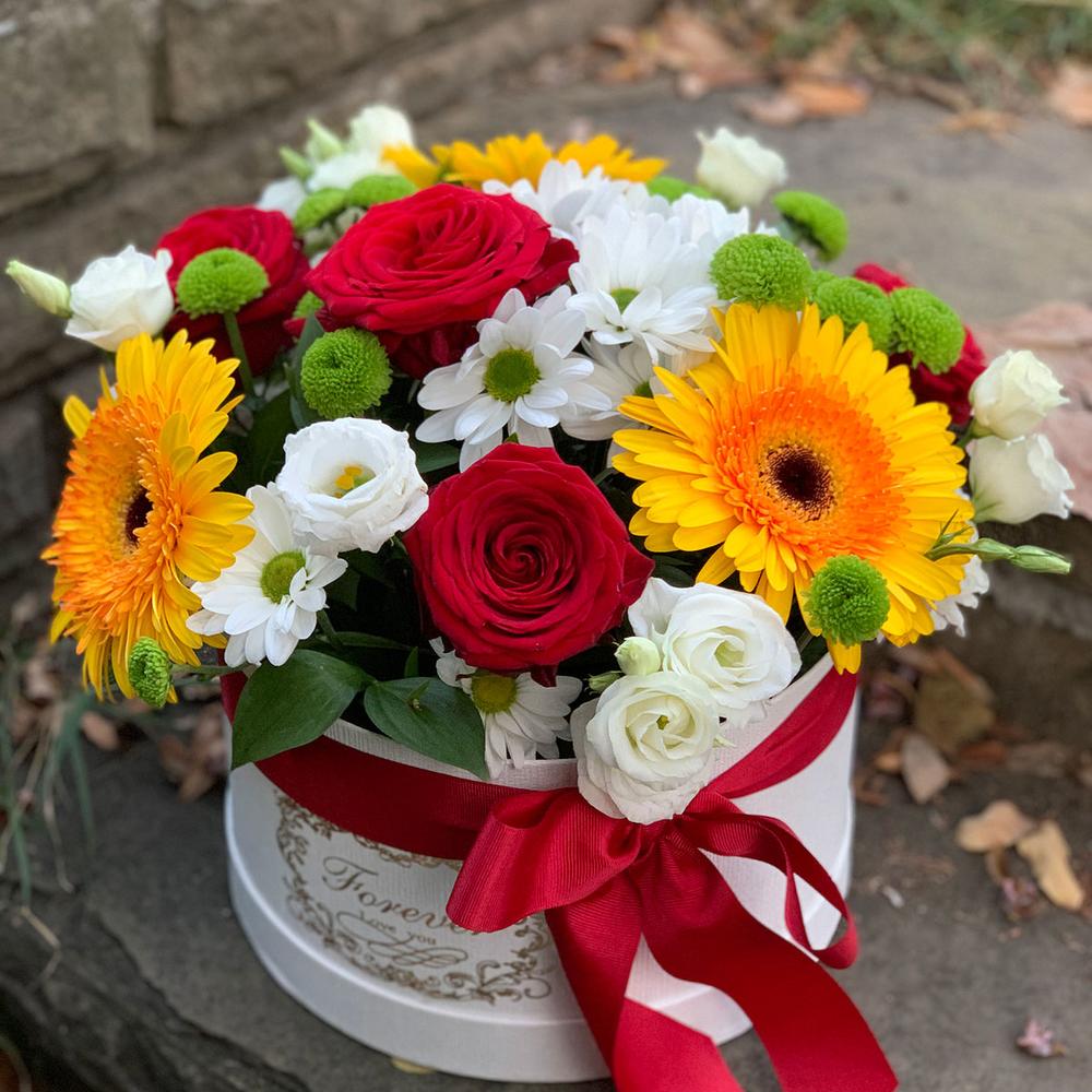 Композиция в коробке из Гербер, роз и хризантем в Лузе